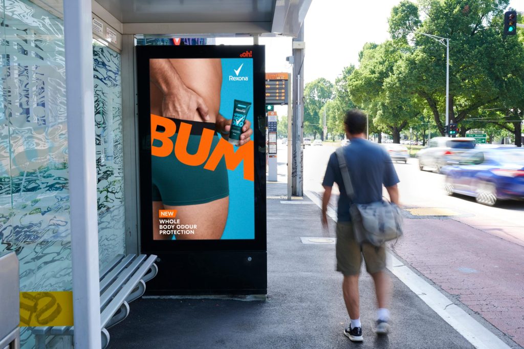 We all sweat. And when we’re most active, we don’t just sweat in one place. Rexona leaned into this truth by confronting the areas people don’t usually talk about — and placing them unapologetically in public spaces. The campaign used oversized, blunt typography — BUM, BOOBS, BACK — layered directly over talent imagery to challenge taboos and spark conversation at scale.